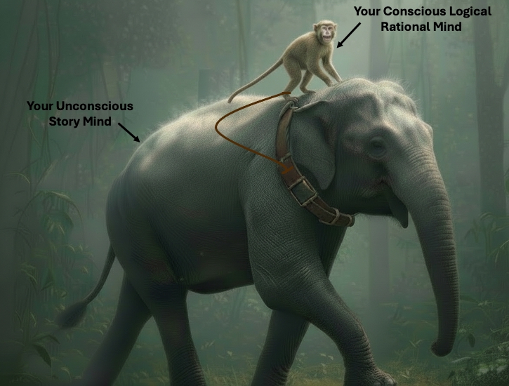 The stories driving your elephant (your unconscious mind) are not always logical or rational and they may or may not serve you, yet they are the engine of your hugely powerful subconscious beliefs that create your reality.