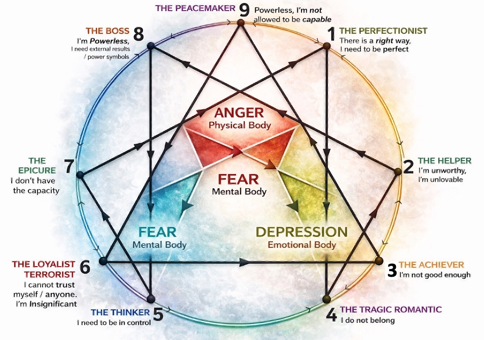 In this context, the three “pain bodies” of the Enneagram correspond to the physical, mental, and emotional stress we experience. They reflect core underlying beliefs that many of us carry subconsciously. In the illustration referenced, these beliefs are expressed in their negative, avoidance-based form rather than in the positive, infatuated form.